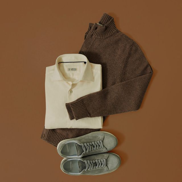 스웨터 하나로도 충분히 멋스러운 가을 스타일을 완성할 수 있지만, 조금 더 세련된 룩을 연출하고 싶다면 심플한 셔츠와 함께 매치하는 것도 좋은 아이디어입니다. 브로이어의 자개단추로 마무리한 코튼 셔츠와 함께라면 낭만적인 가을 룩을 연출할 수 있는데요. 솔리드 트윌 소재의 셔츠는 도톰한 원단과 옐로 톤이 더해져 화사하면서도 따뜻한 느낌을 자아냅니다.
