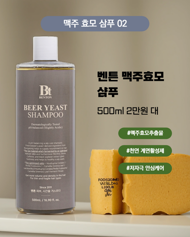 벤튼 샴푸에는 모발의 아미노산 구조와 유사한 맥주 효모 추출물이 함유되어 있어 저자극 안심 케어를 지향하는 샴푸로 유명하다.