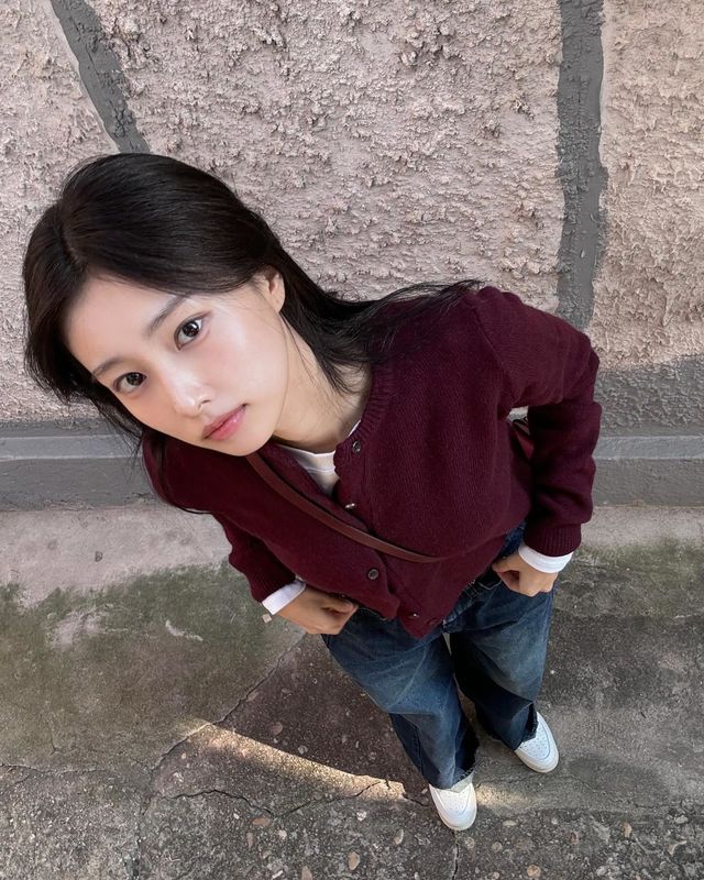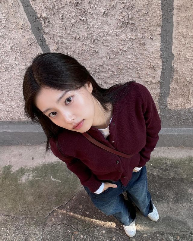 공개된 사진 속 강혜원은 와인 컬러의 가디건에 넉넉한 핏의 데님 팬츠를 매치해 여유로운 분위기를 연출했다. 베이식한 화이트 스니커즈로 마무리된 캐주얼한 룩은 단순하지만 멋스러움이 돋보인다.