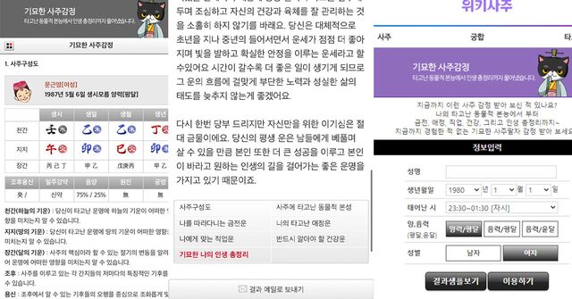 온라인 사주 전문 사이트 '위키사주'는 오랜 전통을 바탕으로 한 사주팔자와 현대적인 분석 기술을 결합하여 각자의 운명을 상세히 분석한다. 이름과 생년월일, 태어난 시간과 성별을 입력하면 간단하게 이용할 수 있다. 특히, 앞으로 3년 동안의 애정을 꿰뚫어볼 수 있는 애정운, 냉정하고 속시원한 궁합, 사랑에 관한 모든것을 담은 타로까지 다양한 운세를 재미있게 점칠 수 있다.
