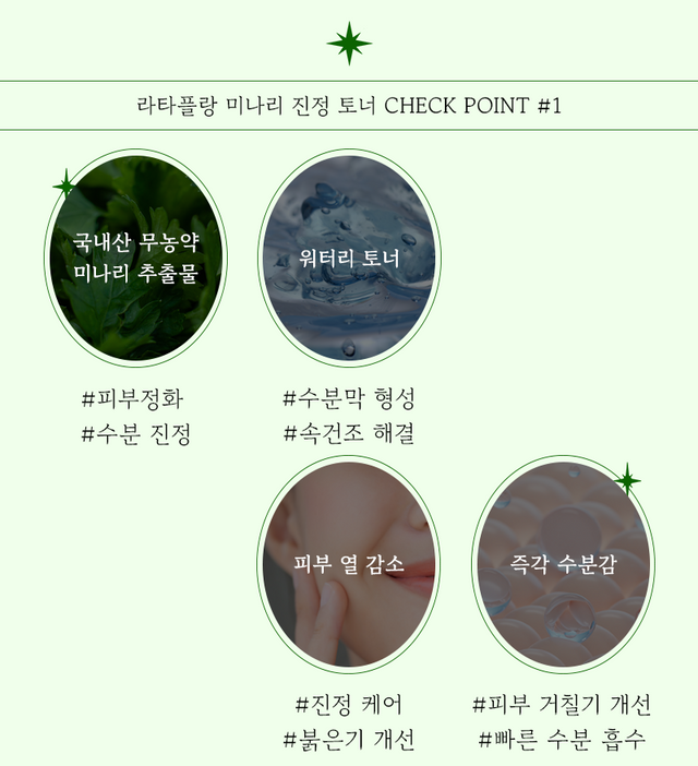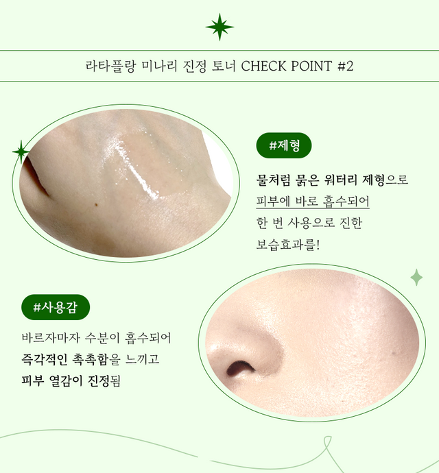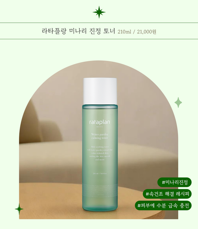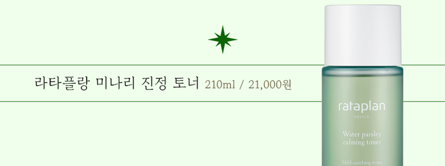 라타플랑 토너는 아무 미나리나 넣지 않았다. 국내산 청정 지역에서 나오는 미나리추출물만을 사용했기 때문에 더욱 안심하고 사용할 수 있다. 진정 효과에 짝꿍처럼 따라오는 것이 있다면 바로 보습효과. 수분감이 가득한 워터 타입의 토너로 보습력도 놓치지 않고 꽉 붙잡았다.
