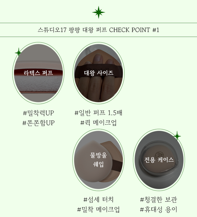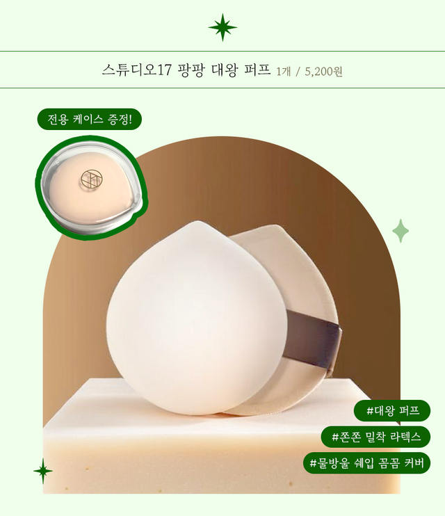 또한 푹신푹신한 공기층이 존재하기 때문에 피부에 자극을 주지 않고 메이크업을 진행할 수 있는데 쫀쫀한 밀착력도 가지고 있어 수정 화장 용으로도 제격이다. 튼튼하고 폭신폭신한 재질 덕분에 여러 번 빨아 사용하기에도 문제없어 올리브영에 가면 구매해 보기를 추천한다.