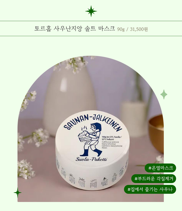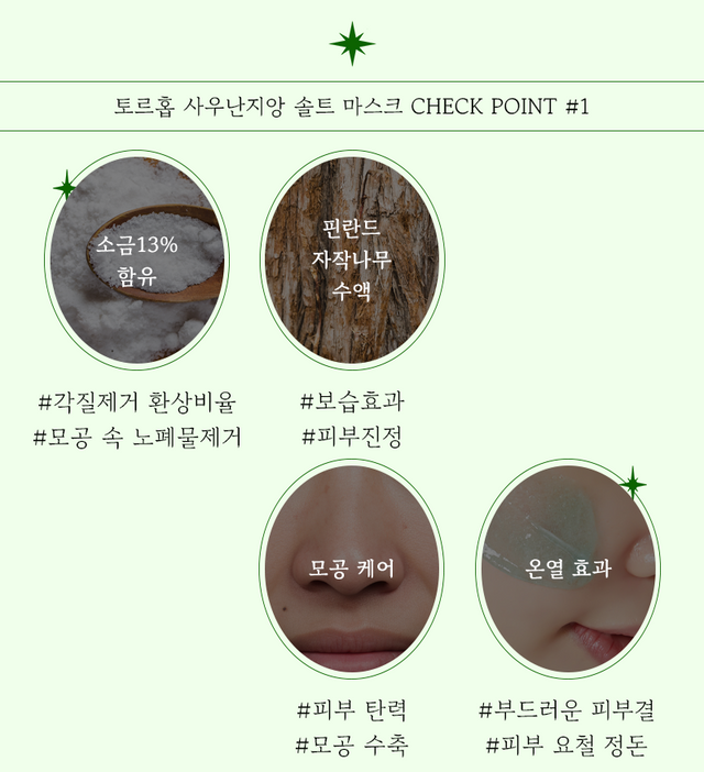 이 마스크 팩에는 이름에도 쓰여 있는 것처럼 소금 성분이 들어있는데 노폐물 제거에 용이한 13%의 황금 비율로 만들어져 조금 더 섬세하고 확실한 각질 제거를 진행할 수 있다. 그뿐만 아니라 바르자마자 열감이 느껴지는 사우나 팩이라 그 열감 덕분에 모공이 확장되어 작은 모공 속의 노폐물까지 제거할 수 있으니 이거 하나만으로도 모공 청소는 끝.