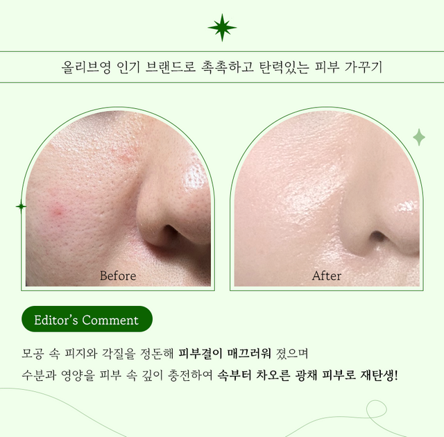관리 후 피부 상태를 보면, 각질과 피지가 정돈되어 요철 부각이 가라앉고 매끄러워졌으며, 진정 성분으로 피부를 토닥토닥 진정시켜주니 트러블과 붉은 기 또한 가라앉았다. 수분과 영양을 가득 채워주니 피부 속부터 차오르는 광채 피부로 재탄생할 수 있었다. 에디터같이 건강한 피부를 갖고 싶다면 올리브영 세일 때 올리브영 추천 아이템들을 구매해 보자.