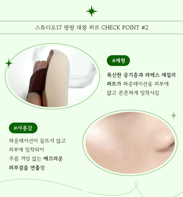 파운데이션은 두드리면 두드릴수록 더 들뜨고 밀착이 안되는데, 이 대왕 퍼프는 크기가 커 한두 번만 두드려도 완벽 밀착이 가능하다. 그래서 바쁜 아침에도 이걸로 팡팡 두드려 주기만 하면 어느 순간 메이크업이 끝나있어 빠른 화장이 손쉽게 가능하다. 그렇다고 크기만 투박하게 큰 것이 아니라 물방울 쉐입이라 파운데이션이 잘 발리지 않는 콧방울 부위에도 섬세한 메이크업이 가능!