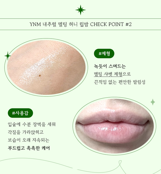 어린아이들도 사용할 수 있는 순한 성분으로 구성되어 온 가족이 사용할 수 있는 안심 립밤으로, 보습 성분도 많이 들어있고 계속 레이어링 해줄수록 그 보습력을 오래 지속할 수 있게 도와준다. 또한, 입술에 닿으면 끈적임 없이 부드럽게 발리는 제형이라 계속 덧발라도 입술만 번지르르 해지는 것을 방지할 수 있었던 것도 매력 포인트.