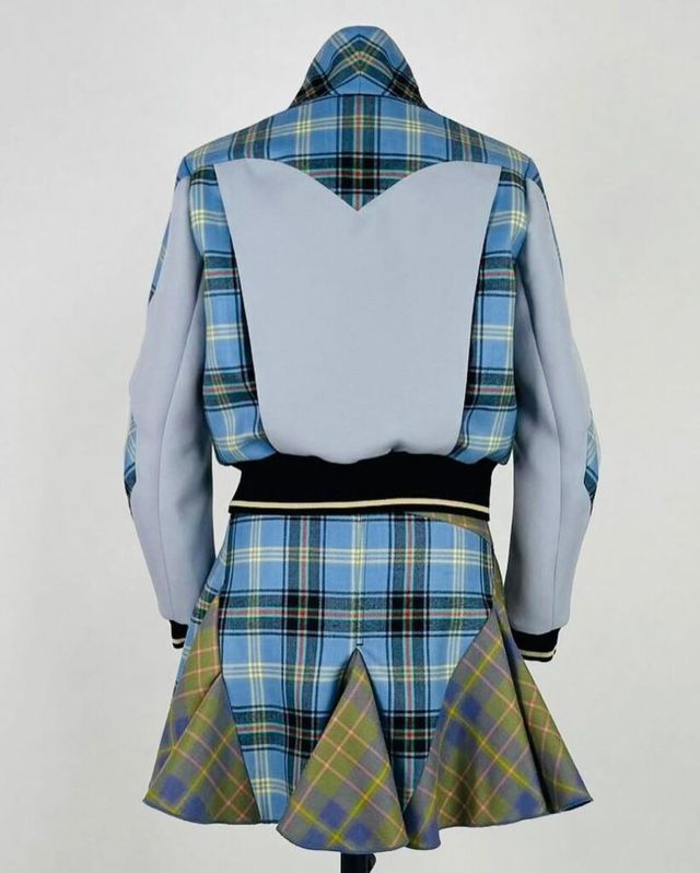 로라와 디아나 패닝은 키코 코스타디노브에서 다채롭고 조화로운 컬러 배색과 비정형적인 패턴 그리고 틀을 벗어나는 디자인을 가미한 여성복 컬렉션을 선보여왔는데요. 뉴진스의 커스텀 의상에는 이들의 컬렉션에서 자주 포착할 수 있는 요소인 체크 패턴을 녹여 멤버들이 가진 소녀스러운 매력과 에너제틱한 분위기를 드러냈죠. 형형색색의 컬러가 교차하면서 다이나믹한 컬러를 형성하고 있는 체크 패턴의 패브릭은 스포티 저지, 스커트, 블라우스 곳곳에 자리잡아 눈길을 끌었습니다.
