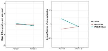 [그래프 설명 : 지중해식(파랑) 환자식(빨강) 그룹 환자 혈청(왼쪽), 소변(오른쪽)에서 검출한 칼륨 수치, 지중해식으로 야채 등을 더 많이 섭취해도 칼륨 수치가 높아지지 않았다.]