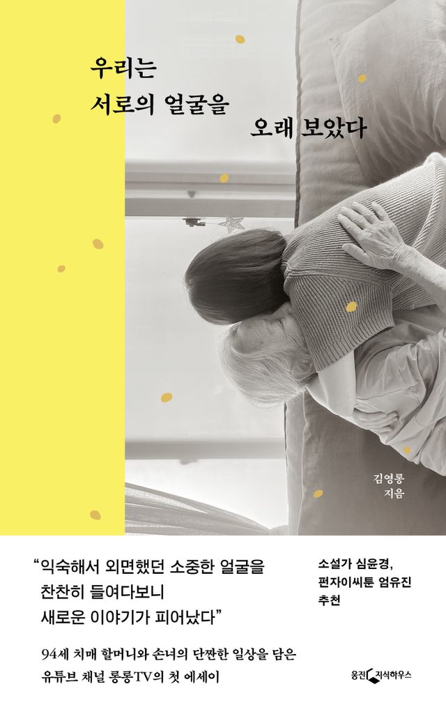 『우리는 서로의 얼굴을 오래 보았다』는 할머니의 치매를 돌보는, 쉽지 않은 매일의 일상 속에서 샅샅이 기쁨을 찾아낸 김영롱의 첫 에세이집이다. 14만 구독자를 보유한 유튜브 채널 ‘롱롱TV’의 유쾌하고 밝은 모습의 영상 너머 수차례 무너졌다 일어서기를 반복하며 할머니와 함께 찾아나선 행복의 여정이기도 한 이 책은 어두워져가던 가족의 얼굴이 어떤 계기로 밝아졌는지, 할머니가 세상과 다시 가까워지며 어떤 표정을 보였는지, 그 모든 과정을 거치며 서서히 깨닫게 된 것들에 대해 담백하고도 진솔하게 담아냈다.
