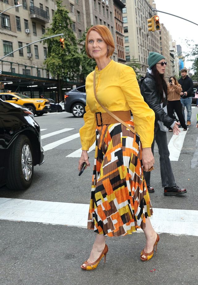 신시아 닉슨은 가을 팔레트를 고스란히 옮긴 듯한 옐로와 브라운 세트업에