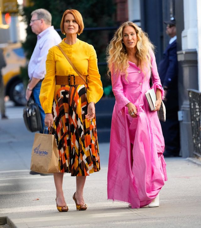 캐리와 '미란다 홉스'의 다정한 투 샷도 함께 포착됐습니다. 이번에도 역시 비비드한 바비 핑크 컬러의 드레스를 걸친 사라 제시카 파커는