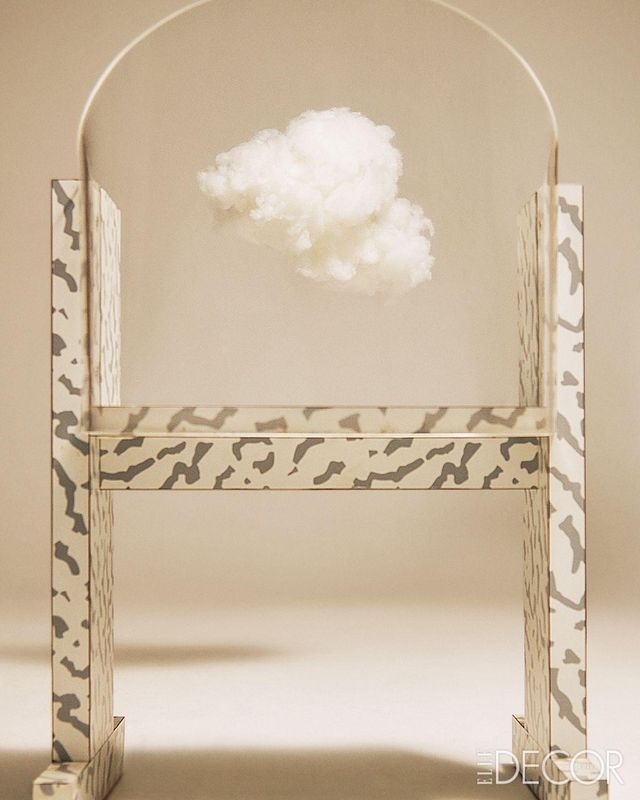 회색 패턴의 흰색 라미네이트 나무와 플렉시 유리가 대조된 ‘테오도라’ 암체어는 Vitra by Muzeum.