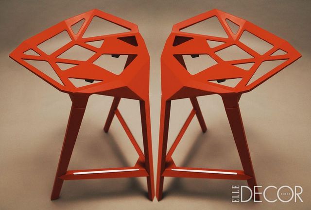여러 개의 삼각형이 결합된 미래적 디자인의 ‘스툴 원 레드’ 스툴은 Magis by Rooming.