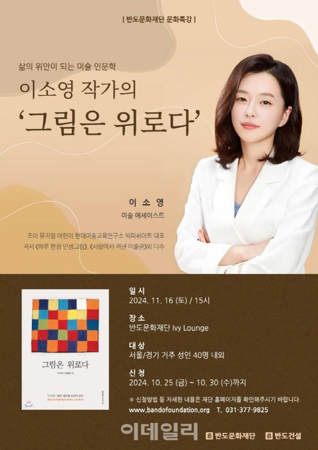이번 강연은 이소영 작가의 저서 ‘그림은 위로다’를 통해 다양한 화가의 작품과 삶을 소개하고 우리의 삶에 적용할 수 있는 긍정적인 가치관을 공유하는 시간이 될 예정이다.
