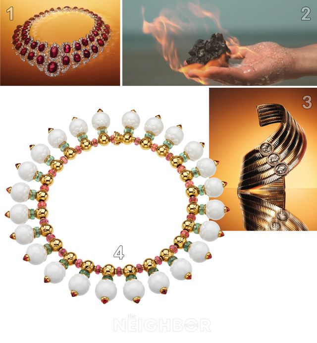 1 골드와 플래티넘 소재에 루비, 다이아몬드를 세팅한 네크리스. 2 이웅철 작가의 작품. 3 1972년경 만들어진 모네떼 투보가스 초커. 4 헤리티지 컬렉션 찬드라 네크리스.