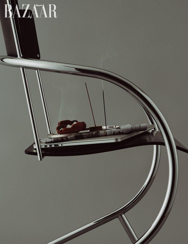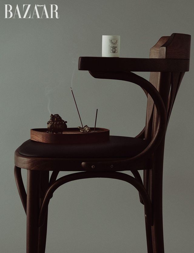 빈티지 다이닝 체어는 DKFF. 우드 인센스 홀더는 Sohosu by Twl Shop. 손 모양 인센스 홀더는 이혜인 소장품. 실버 플레이트는 스타일리스트 소장품.