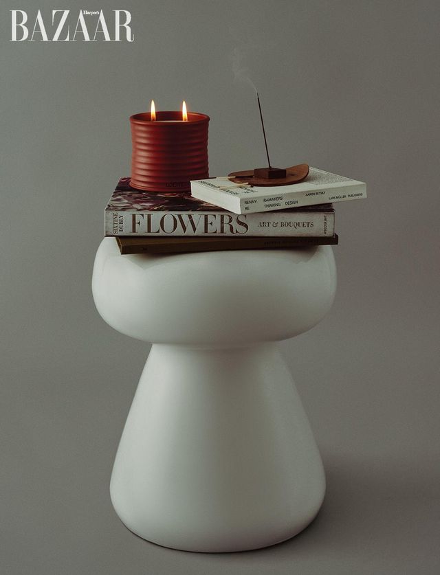 (위부터) 우드 인센스 홀더는 Sohosu by Twl Shop. 아트 북 〈Flowers Art & Bouquets〉는 Assouline. 트래블 포토 북 〈아르메니아〉는 Louis Vuitton. 스툴은 Gervasoni. 레니 라메이커스의 디자인 북은 스타일리스트 소장품.