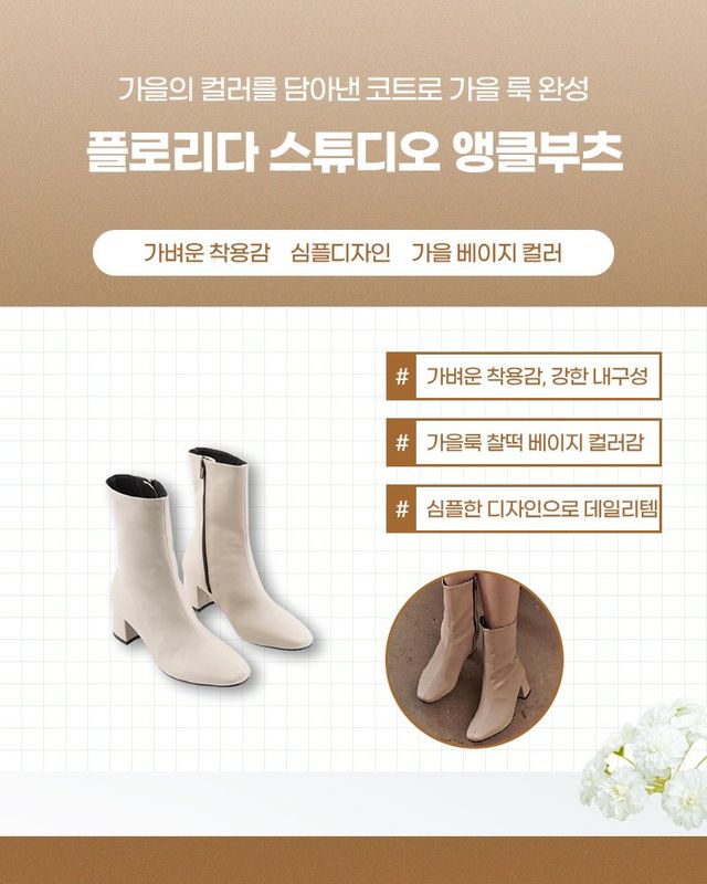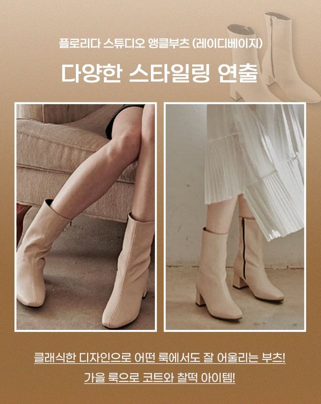 이 부츠는 가벼운 착용감이 큰 장점이어서 하루 종일 신어도 편안하고, 내구성이 뛰어나 오래 신어도 변형 없이 깔끔하게 유지된다. 특히 베이지 컬러는 어떤 가을 코디에도 자연스럽게 어울려서 스타일링하기 아주 쉽다. 게다가 심플한 디자인 덕분에 데일리로도 활용하기 좋아서 다양한 룩에 부담 없이 매치할 수 있는 만능 아이템! 가을룩을 완성하고 싶다면, 이 앵클부츠로 세련된 스타일을 완성해 보는 건 어떨까?
