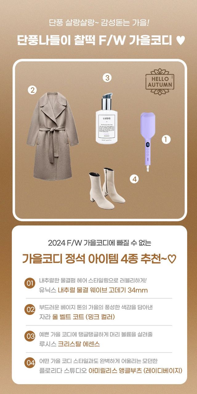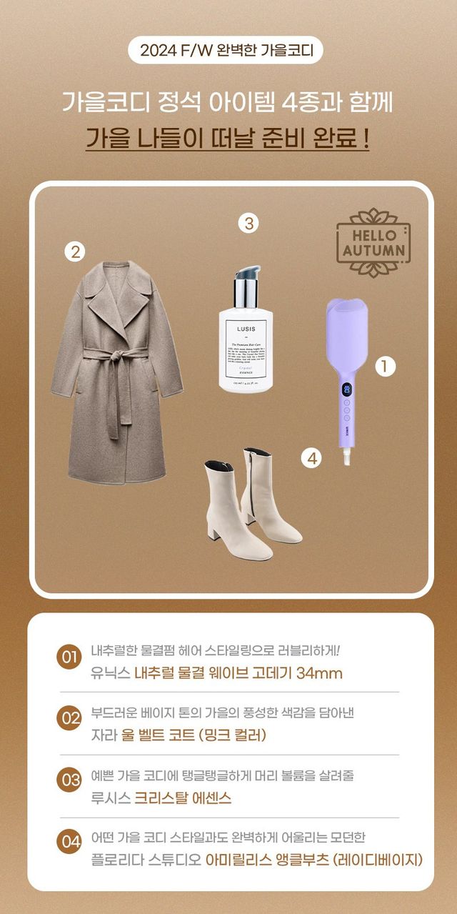 내추럴한 물결펌 헤어 스타일링을 원한다면 유닉스 물결 고데기를, 가을의 멋을 살리면서 포근한 분위기를 원한다면 자라 울 코트 베이지 컬러를, 머릿결을 건강하게 가꿔주고 싶다면 루시스 크리스탈 에센스를, 가을과 어울리는 세련된 신발을 원한다면 플로리다 스튜디오 아미릴리스 앵클부츠를.
