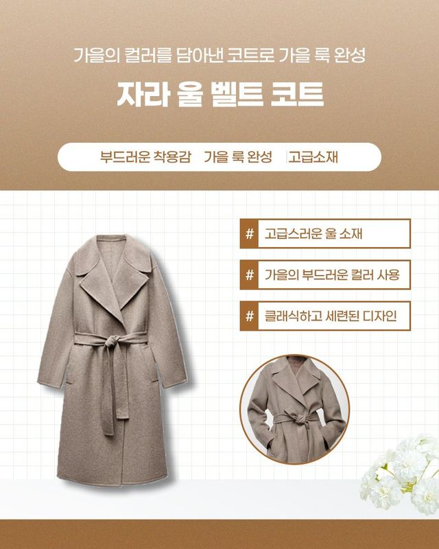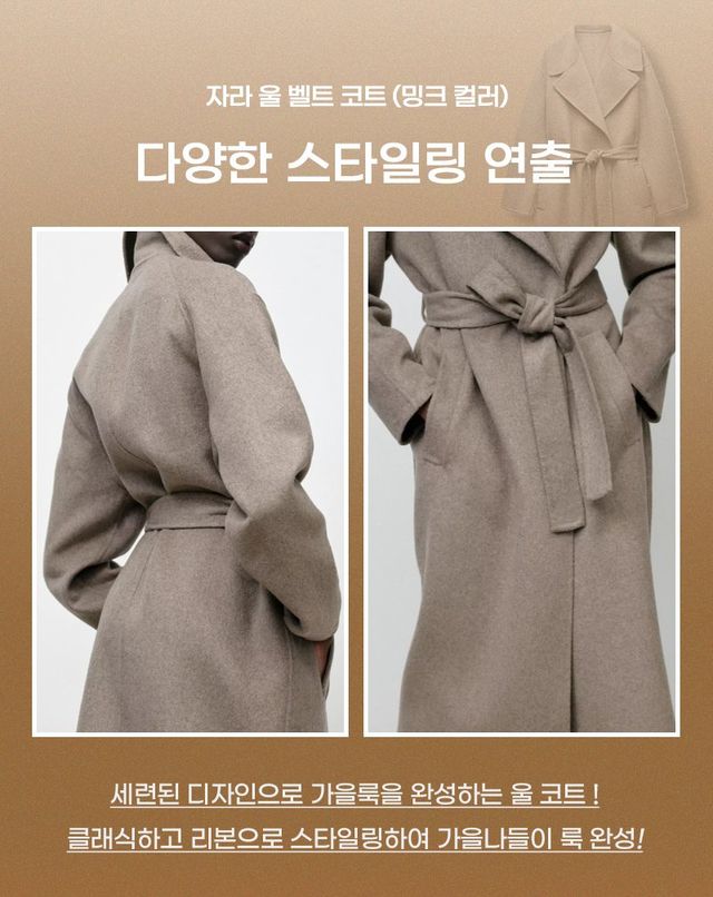 이 코트는 고급스러운 울 소재로 제작되어 따뜻하면서도 자연스럽게 떨어지는 실루엣을 자랑하며, 부드러운 컬러감 덕분에 다양한 스타일에 쉽게 매치할 수 있다. 또한, 클래식한 라펠 디자인과 허리 라인을 강조해 주는 벨트 디테일로 세련된 분위기를 연출해 주니 어떤 자리에서도 스타일리시하게 보일 수 있다. 고급스러운 소재와 깔끔한 디자인, 그리고 실용성을 겸비한 자라 울 벨트 코트로 올가을, 겨울룩을 완성해 보자!