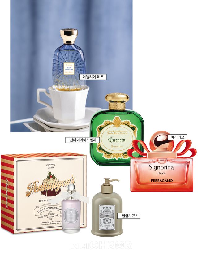 아뜰리에 데조의 블루 마들렌은 브랜드 창립자인 장 필리프 클레르몽이 어린 시절 할머니와 함께한 추억을 회상하며 제작한 향수다. 스모키한 티 어코드와 스파이시한 핑크 페퍼 노트가 부드러운 홍차를 마시며 즐거웠던 순간을 생생하게 묘사한다. 베이커리 테마의 퍼퓸도 있다. 펜할리곤스의 크리스마스 베이커리 컬렉션이 그 주인공. 장미와 베르가모트의 달콤한 하모니와 여운을 담은 이 매혹적인 제품은 한정 수량 출시되니 참고하자. 페라가모는 새로운 여성 향수 세뇨리나 우니카를 선보인다. 우디 구르망 블렌드 계열로 사용하는 이의 독특하고 자유로운 매력을 배가한다. 피렌체 메디치 정원에 자리한 아주 오래된 오크나무에서 영감 받은 산타마리아노벨라의 퀘르치아 오 드 퍼퓸은 흙 내음을 품은 오크우드 베이스와 아로마틱한 우디의 조향이 묵직한 존재감을 드러낸다.