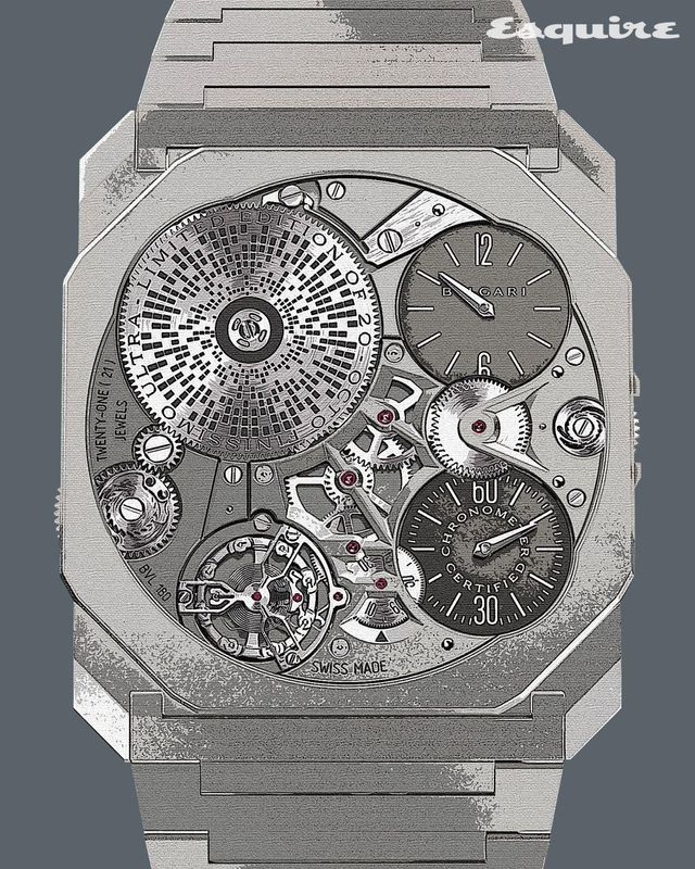 」울트라-씬 분야의 치열한 경쟁은 현재진행형이다. 2022년 두께 1.80mm의 옥토 피니씨모 울트라는 세계에서 가장 얇은 시계에 당당히 이름을 올렸으나 몇 개월 만에 자리를 내주고 말았다. 하지만 올해 불가리는 두께 0.05mm를 줄이며 다시 한번 왕좌를 탈환했다. 케이스 두께가 1.70mm에 불과한 옥토 피니씨모 울트라 COSC가 바로 그 주인공. 시계는 다이얼과 케이스, 무브먼트의 경계를 허물고, 부품을 수평으로 배열해 두께를 최소화한 것이 특징. 시, 분, 초침과 심장인 밸런스, 동력인 배럴이 각기 흩어지고 혼재하는 독특한 구성을 가져왔다. 케이스 강성을 강화하기 위해 티타늄과 텅스텐 카바이드를 사용한 대목도 인상적이다. 한편 불가리는 극단적으로 얇은 두께를 추구하면서 외관과 세부 그 무엇도 놓치지 않았다. 배럴 표면에는 그래픽을 새겨 아름다움을 살렸고 COSC 인증을 받아 정확성까지 증명했다. 울트라 신 워치메이킹의 첨단 기술력과 예술적 미학까지 모두 갖춘 셈.