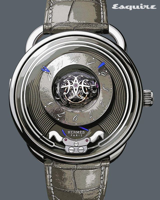」에르메스 하이 워치메이킹의 성장을 보여주는 아쏘 뒥 아뜰레. 에르메스가 가진 마구에 대한 전통과 유산을 정교한 컴플리케이션에 대입했다. 다이얼 살짝 위쪽에 위치한 더블 H 이니셜의 3축 투르비용은 마치 공과 같이 회전하며 중력의 간섭을 최소화하는데, 각각의 축은 300, 60, 25초에 한 바퀴를 돌며 3만6000vph의 높은 진동수로 하이 비트 멀티 액시스 투르비용이라는 새로운 업적을 세웠다. 투르비용 주위에선 말머리 모양의 해머로 소리 굽쇠 공을 때리는 미니트 리피터의 주요 구조를 확인할 수 있다. 비교적 심플한 다이얼 사이드와 달리 케이스백은 컴플리케이션 테마를 더욱 심층적으로 조명한다. 마차의 바퀴살 같은 기어, 말의 형상을 한 미니트 리피터 랙 등 철저한 디테일로 주제를 구체화했다.