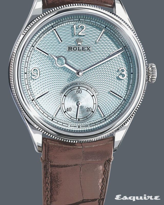 」퍼페추얼 1908은 회중시계에서 손목시계 시대로 접어든 1900년 초반의 디자인을 2024년식으로 해석한 모델. 이 시계는 기술적, 미학적으로 풍요로웠던 당시의 시대상과 여유를 잘 보여준다. 다이얼은 전통적인 낱알 기요세 패턴인 그랑 도르주(Grain d'orge)로 정교하게 장식하고, 차가운 아이스 블루 컬러로 완성했다. 피어싱 처리한 원형 장식 시침과 스몰 세컨드는 클래식 워치의 전형적 디테일이라 할 만하다. 여간해서는 무브먼트를 보여주지 않는 롤렉스가 케이스백에 드러낸 칼리버 7140도 꽤나 흥미로운 볼거리다.