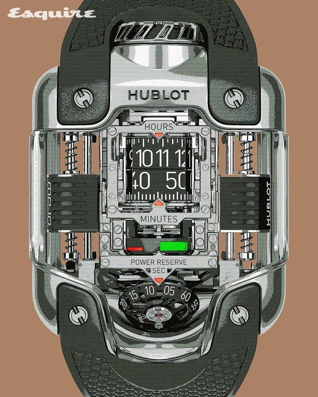 」위블로의 독창적인 컴플리케이션을 지칭하는 MP(Master Piece) 시리즈에서 최신 모델이 등장했다. 무게추의 힘을 이용해 동력을 전달하는 모델로, 시간을 나타내는 두 개의 드럼 디스크 좌우로 나란히 놓인 웨이트가 위, 아래로 움직이며 힘을 축적한다. 마치 자동차 엔진의 피스톤처럼 작동하는 웨이트는 시원한 개방감을 선사하는 사파이어 크리스털 글라스로 동적 감각을 극대화한다. 회전하는 로터 대신 리니어 웨이트를 택하면서 수직 연결로 전반적인 구조를 설계한 점도 인상적. 비스듬히 놓인 투르비용 케이지와 두 개의 컬러로 동력 잔량을 나타내는 파워 리저브 디스플레이가 이를 증명한다. 티타늄 케이스는 레이싱카의 외관처럼 매끈하고 슬릭하며, 독특하게 연결한 러버 밴드 역시 MP 시리즈의 독창성을 주장한다.