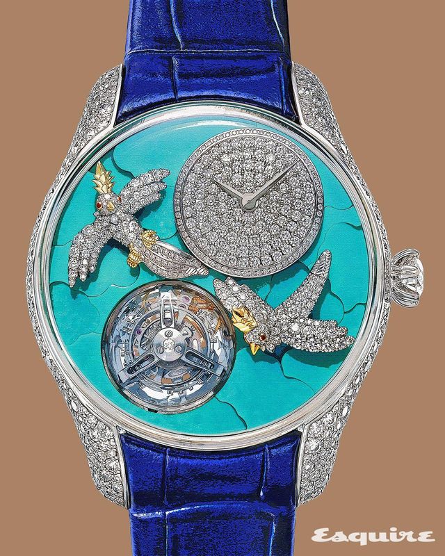 」티파니의 주얼리 디자이너 쟌 슐럼버제(Jean Schlumberger)의 1965년 작 ‘버드 온 어 록’ 브로치에서 영감을 받아 브랜드 최초의 플라잉 투르비용 워치가 등장했다. 커다란 젬스톤 위에 올라선 다이아몬드 새 모티브를 시계 다이얼에 이식한 것. 기계적인 면모를 드러내는 플라잉 투르비용은 튀르쿠아즈 스톤을 마케트리 기법으로 완성한 다이얼에 둘러싸여 있다. 천연 스톤의 미묘한 패턴과 톤 차이를 살린 튀르쿠아즈 스카이는 구름 모양으로 잘라낸 16개의 조각으로 구성되며, 다이아몬드로 화려하게 장식된 한 쌍의 새가 푸른 하늘을 날아오른다. 메티에다르 다이얼과 케이스에 발휘한 잼 세팅의 아름다움은 케이스백에서 한 번 더 드러난다. 투르비용 칼리버 AFT24T01의 브리지를 장식한 스노 세팅은 프롱(Prong)을 드러내지 않는 고급 기법이다. 투르비용의 기술력, 메티에다르의 아름다움과 잼 세팅의 기교를 하나의 시계로 아우르는 아트 피스다.