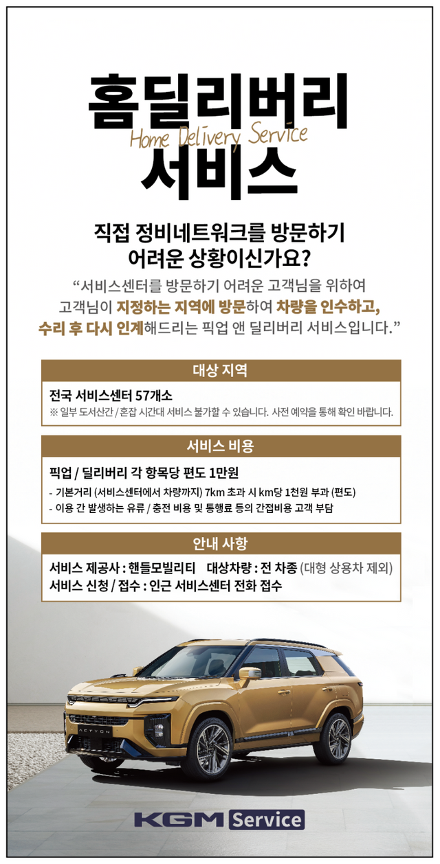 KGM 관계자는 “고객 감동 및 품질 만족도 향상을 위해 생산, 판매, 서비스 등 모든 고객접점 부문에서 변화를 모색하고 있다”며 “이번 홈 딜리버리 서비스 시행을 통해 고객 편의성을 더욱 극대화 시키고 보다 많은 고객들이 이용할 수 있는 서비스를 점차 확대해 나갈 계획이다”고 말했다.