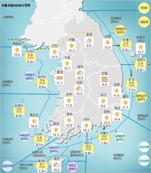 10월 30일 전국 날씨는 다음과 같다.