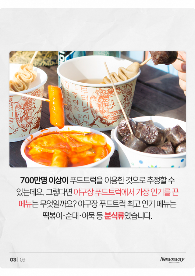 700만명 이상이 푸드트럭을 이용한 것으로 추정할 수 있는데요. 그렇다면 야구장 푸드트럭에서 가장 인기를 끈 메뉴는 무엇일까요? 야구장 푸드트럭 최고 인기 메뉴는 떡볶이·순대·어묵 등 분식류였습니다.
