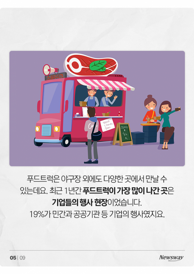 푸드트럭은 야구장 외에도 다양한 곳에서 만날 수 있는데요. 최근 1년간 푸드트럭이 가장 많이 나간 곳은 기업들의 행사 현장이었습니다. 19%가 민간과 공공기관 등 기업의 행사였지요.