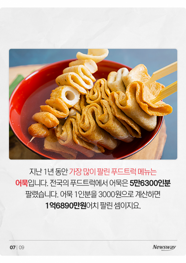 지난 1년 동안 가장 많이 팔린 푸드트럭 메뉴는 어묵입니다. 전국의 푸드트럭에서 어묵은 5만6300인분 팔렸습니다. 어묵 1인분을 3000원으로 계산하면 1억6890만원어치 팔린 셈이지요.