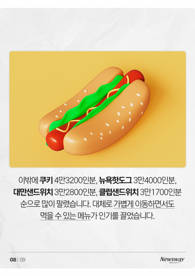 이밖에 쿠키 4만3200인분, 뉴욕핫도그 3만4000인분, 대만샌드위치 3만2800인분, 클럽샌드위치 3만1700인분 순으로 많이 팔렸습니다. 대체로 가볍게 이동하면서도 먹을 수 있는 메뉴가 인기를 끌었습니다.