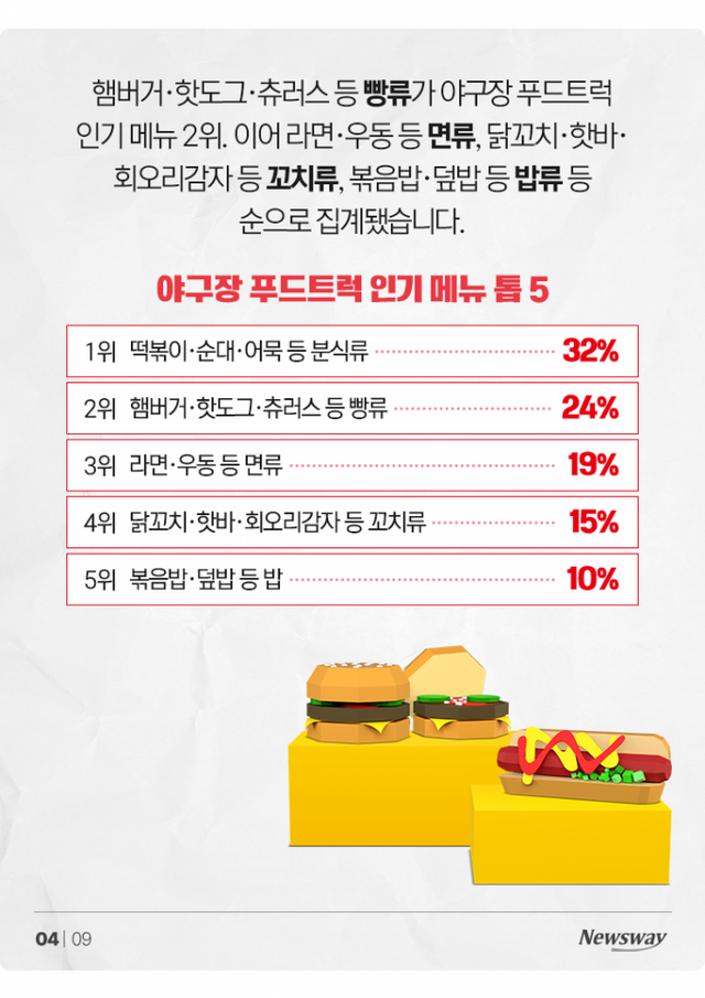 햄버거·핫도그·츄러스 등 빵류가 야구장 푸드트럭 인기 메뉴 2위. 이어 라면·우동 등 면류, 닭꼬치·핫바·회오리감자 등 꼬치류, 볶음밥·덮밥 등 밥류 등 순으로 집계됐습니다.
