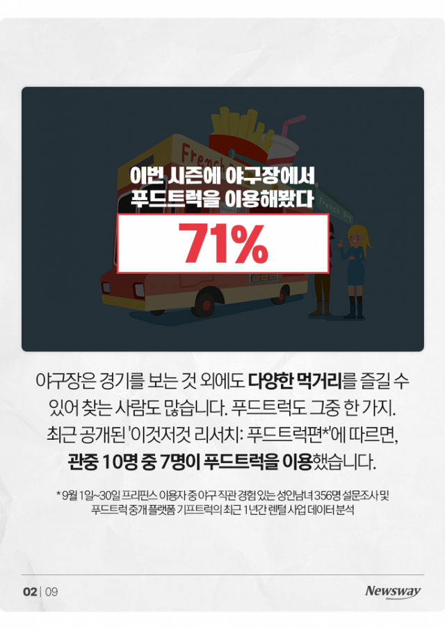 야구장은 경기를 보는 것 외에도 다양한 먹거리를 즐길 수 있어 찾는 사람도 많습니다. 푸드트럭도 그중 한 가지. 최근 공개된 '이것저것 리서치: 푸드트럭편'에 따르면, 관중 10명 중 7명이 푸드트럭을 이용했습니다.