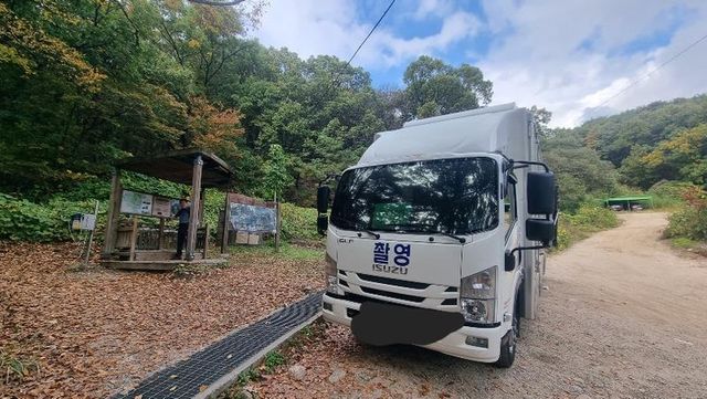 해당 여성이 촬영 트럭의 백미러 바로 뒤에 설치한 캠핑 의자에 앉아 있었다며 촬영 트럭과 고압 먼지털이가 설치돼있는 등산로 입구 사진도 함께 공개했다.
