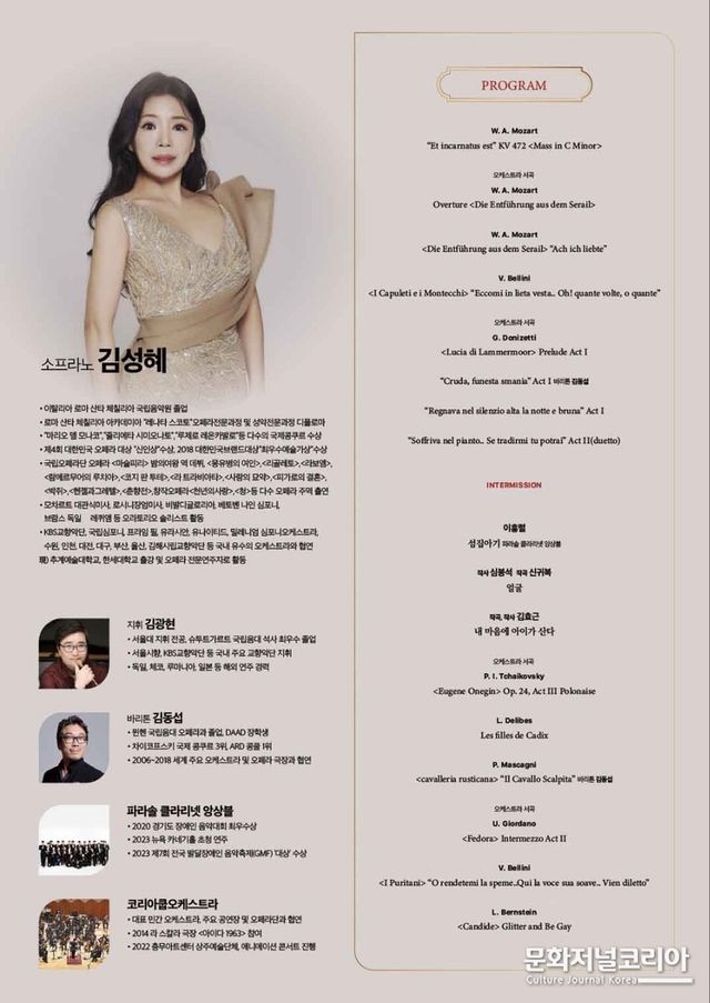 리사이틀의 출연진으로는 김성혜 소프라노와 함께 코리아쿱오케스트라가 무대에 오른다. 김광현 지휘자의 지휘 아래 펼쳐질 코리아쿱오케스트라의 연주는 무대에 웅장함을 더하고, 김동섭 바리톤과의 협연 또한 이번 공연의 백미가 될 것이다. 두 사람이 함께 펼칠 오페라 아리아는 섬세하면서도 강렬한 감동을 선사할 것으로 기대된다.