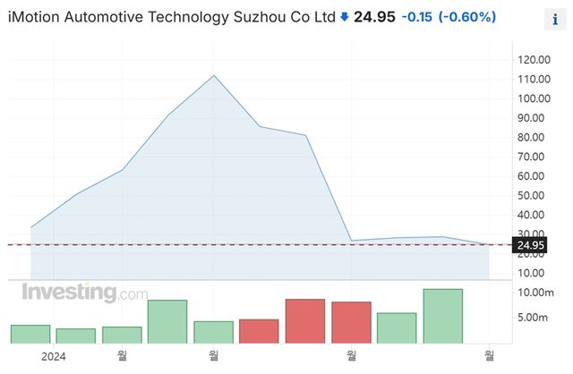 아이모션 주가는 지난해 12월 홍콩거래소에 상장된 이후 올해 4월 122.2홍콩달러(2만1748원)까지 상승했지만, 미국 조 바이든 정부의 중국 견제 정책 심화로 지난 29일(현지시간, 종가기준) 25.1(4467원)홍콩달러로 폭락했다. 반년 만에 5분의 1토막 수준으로 쪼그라든 것이다.