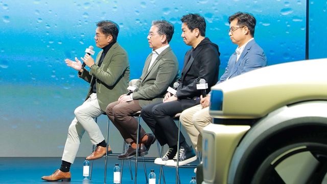 기자 질의응답 시간에 답하는 현대차 임원. 왼쪽부터 김창환 전동화에너지솔루션담당 전무, 장재훈 사장, 이상엽 현대제네시스 글로벌디자인담당 부사장, 정진환 차량개발2담당 전무. / 권혁재 PD