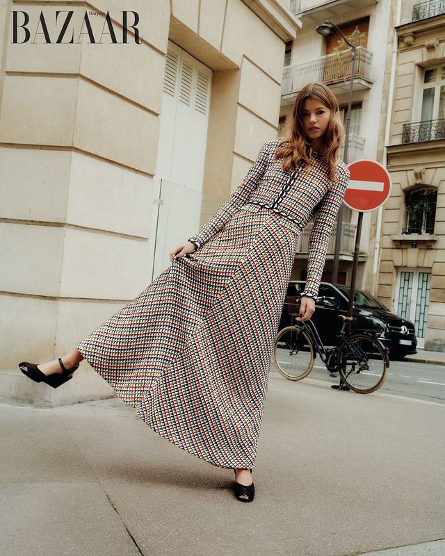 건축물 ‘시테 라디외즈’의 격자 모티프 포켓이 돋보이는 재킷, 이너 셔츠, 반지, 페이턴트 플랫 슈즈는 모두 Chanel.