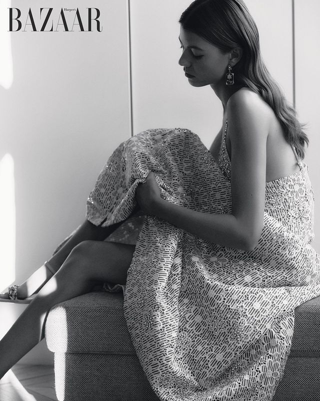 플로럴 자수 드레스, 귀고리, 샌들 힐은 모두 Chanel.