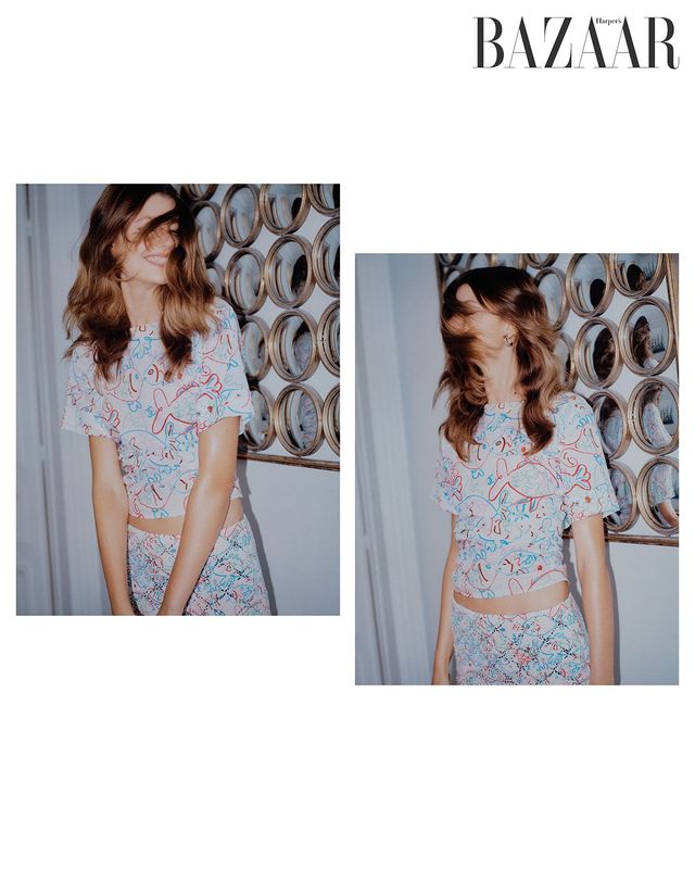 프린트 티셔츠, 스커트, 귀고리는 모두 Chanel.