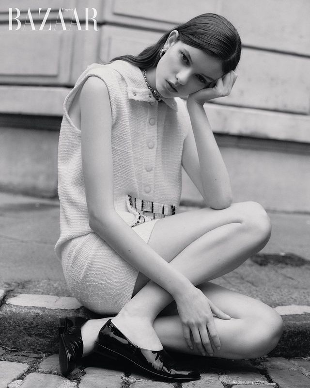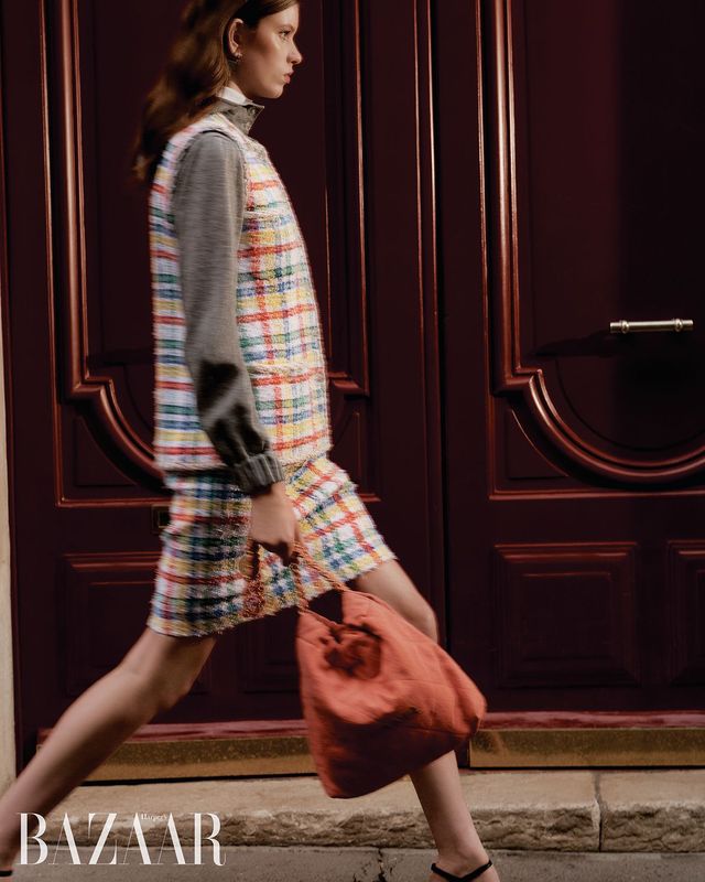 트위드 소재 후디 재킷, 스커트, 귀고리, ‘샤넬 22’ 백, 스트랩 힐은 모두 Chanel.