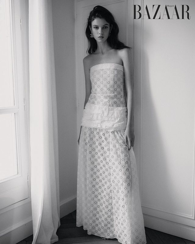 레이스 펀칭 드레스, 귀고리는 Chanel.