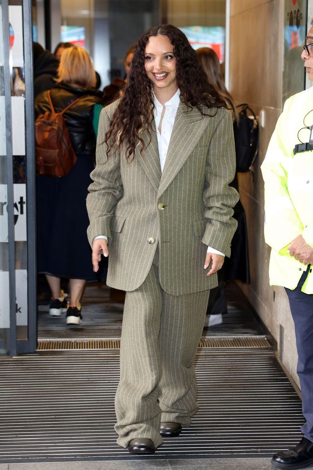 제이드 서월의 스트라이프 파워 수트! 작고 귀여운 체형도 오버사이즈 걸 보스 룩을 연출하는데 문제없습니다. 은은한 올리브 컬러와 얇은 화이트 스트라이프가 부드럽고 섬세한 분위기를 더해주기까지 하죠.