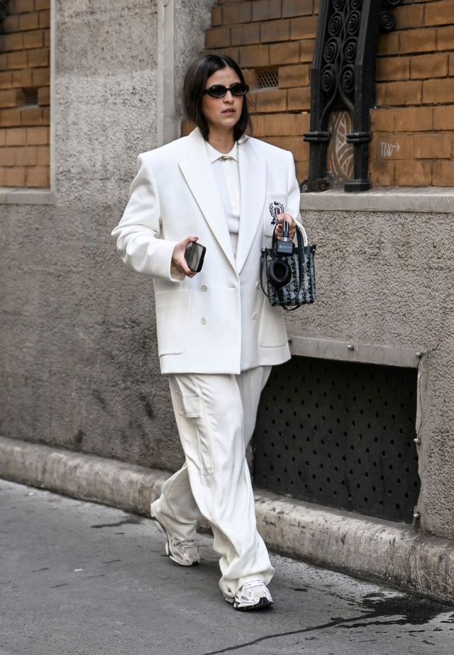 위엄 있는 레트로 파워 수트는 캐주얼한 터치를 가미했을 때 더욱 스타일리시해집니다. 니트 폴로셔츠와 스니커즈가 더해진 경쾌한 크림 화이트 수트 룩!
