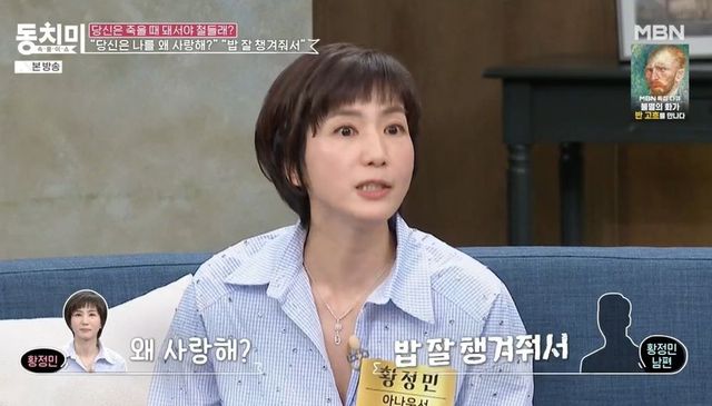 그러나 황정민은 남편과의 속상했던 일화를 공개했다. 황정민은 “남편이 손이 많이 가는 스타일은 아니다. 근데 해맑다고 해야 하나, 소년 같다. 아들도 아니고 형제가 같이 사는 것 같다”라고 말문을 열었다.
